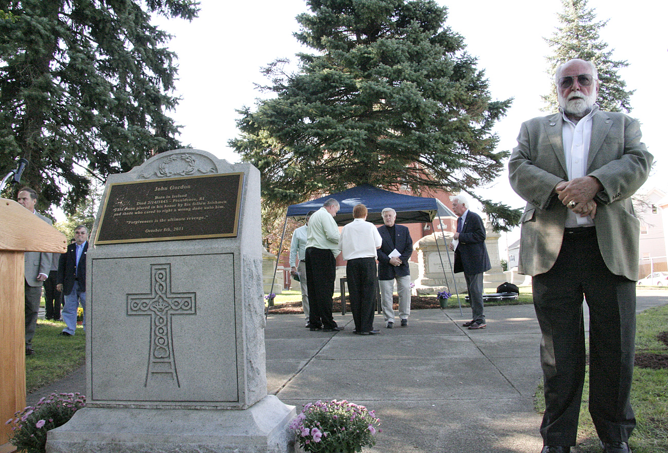 By ETHAN SHOREY, Valley Breeze Staff Writer - 10/11/2011 PAWTUCKET - Nowadays, all one who stands accused of a crime needs is a shadow of a doubt in the minds of the jury to walk away a free man. All the shadows of doubt in the world couldn't save John Gordon. Nearly 170 years after his death, the last man legally executed in Rhode Island was finally "laid to rest" last Saturday, bestowed with a headstone somewhere above where he lies in an unmarked grave at Pawtucket's St. Mary's Cemetery, that hallowed ground where the Wilsons and Burnses are buried. After years of debate, on June 29 of this year, Gov. Lincoln Chafee issued a pardon to Gordon, stating as he did that Gordon did not commit the murder for which he was hanged at the age of 29 back on Valentine's Day, 1845. "Justice has no statute of limitations," said Patrick Conley, the author of "The Irish in Rhode Island," chairman of the Rhode Island Publications Society and a longtime professor of history in the state, during last Saturday's ceremony. Members of the Pawtucket Friendly Sons of St. Patrick, who sponsored the honorary events for Gordon, had advocated for the pardon. They say Gordon's "final vindication" goes a small way toward bringing some justice long after what is believed to be one of the most tainted murder trials in American history. The marker that will now pay lasting tribute to Gordon is inscribed with the words, "This stone placed in his honor by his fellow Irishmen and those who cared to right a wrong done unto him. 'Forgiveness is the ultimate revenge.'" Listen some of the music from last Saturday's event, Rhode Island Rep. Peter Martin, a Democrat who represents Newport in District 75, was the lead sponsor of the legislation Chafee signed to clear Gordon's name. Gordon's pardon in Amasa Sprague's beating death was nearly four decades in the making, said Martin, and even to the end was opposed by a few state leaders who considered debate over its merits to be a waste of time on the part of the General Assembly. It was not until Ken Dooley wrote his play, "The Murder Trial of John Gordon" in 2009, that he and others finally gained the momentum they needed for a pardon, said Martin. Gordon was convicted of killing Amasa Sprague, a wealthy mill owner and the brother of William Sprague, the senator who stepped down from his position to pursue Amasa's killer. Gordon was subjected to a trial that history tells us was full of bigotry against his Irish Catholicism. Experts have said the evidence against Gordon was circumstantial at best. There were innumerable problems, including the banning of Catholics from the jury and a "bloodstained" coat that was later discovered to have been stained with dye. The prostitute who identified the winter coat as belonging to Gordon would have had no business being in Cranston during the winter months. The jury's verdict found John Gordon guilty and brother William innocent, even though a main witness for the prosecution, the prostitute, mistook the two brothers for each other. Gordon was sent to the gallows of the old state jail. The site today is occupied by the Providence Place mall. His trial was a key factor in the death penalty being abolished in Rhode Island in 1852. Gordon was a man who worked hard during the week and regularly attended Mass each weekend, according to Conley. He may not have been a martyr in the traditional sense of the word, someone who died for his faith, but there has never been any doubt that he died because of his faith. There had been heavy anti-Irish sentiment after the Dorr Rebellion, said Conley, but hatred against Catholics was even more intense. It was the reformer Thomas Wilson Dorr and his followers who were some of the strongest advocates for Gordon's acquittal. History offers little or nothing to suggest Gordon as a prime suspect in Sprague's murder, Conley later told The Breeze. There was no prior criminal activity and no suspicious activity. A key point on the part of the prosecution was the idea that Gordon's brother Nicholas had ulterior motives for bringing his family over from Ireland to Rhode Island, that he wanted Sprague dead. "They thought he was trying to import an assassin, that somehow the two brothers would wreak revenge on Amasa Sprague," said Conley. John Gordon had arrived in America only a few months before he was arrested for the murder of Sprague. The mill owner had used his influence to have the Cranston City Council pull Nicholas Gordon's liquor license and Sprague wasn't too happy that his employees were buying liquor at Gordon's store and getting drunk before work. Nicholas Gordon's murder trial ended in a hung jury. John Gordon had attended Mass the morning before Sprague was killed, "hardly a prelude to murder," said Conley. The strongest evidence used to implicate him involved a broken gun found at the scene of the crime that supposedly belonged to Nicholas Gordon. The prosecution belabored the fact that no one could prove the weapon didn't belong to Nicholas and the trio of brothers were not able to produce the gun he did own. Following John Gordon's conviction, William Gordon admitted he had hidden the gun out of fear. William later produced the gun, prompting an appeal of John Gordon's conviction. The appeal was never heard. The seeds of Gordon's death were sown years before Sprague's murder, according to Conley. Back in 1838, Henry B. Anthony and his Providence Journal "launched its relentless campaign against the foreign vagabond," the Irish, according to Conley's book. The Journal's push to rid Rhode Island of the Irish was responsible for "setting in motion the wave of nativism which engulfed Rhode Island in the 1840s and 1850s," it reads. In the same way that it was nearly impossible to tie Gordon to Sprague's murder more than 160 years ago, said Scott Molloy, another Irishman and University of Rhode Island professor, it was equally as difficult to gather enough evidence to finally exonerate him so long after