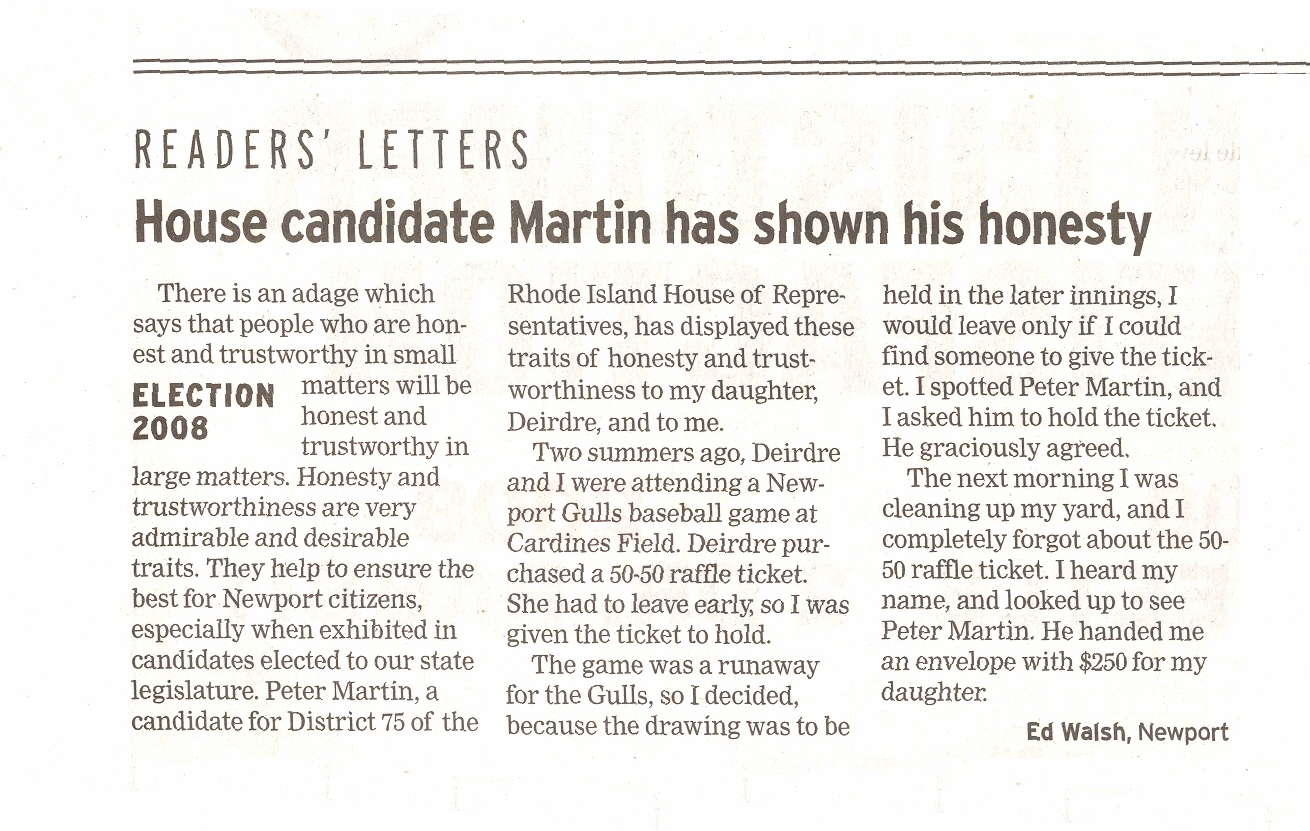 The above, unsolicited letter appeared in the July 25, 2008 issue of the Newport Daily News.