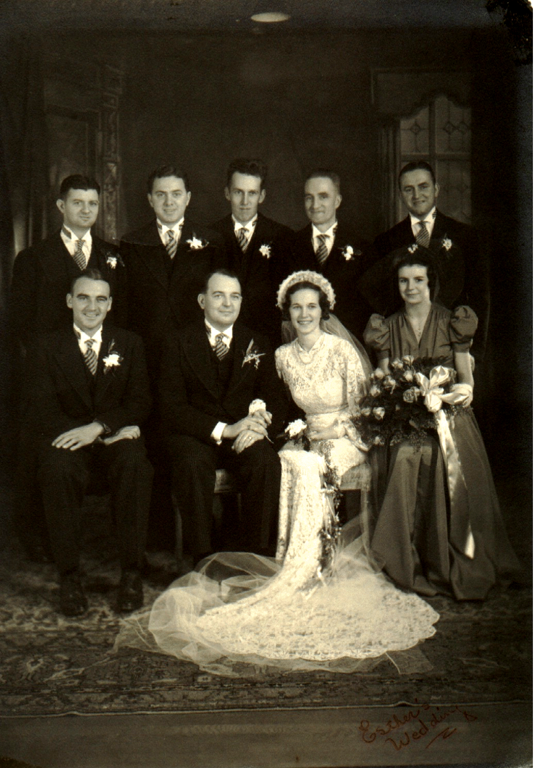 Mom and Dad were married on November 14, 1938 at St. Joseph's Church in Newport. The attendants were [back row] Bill Kehew, Jim Gleason, Charlie Ringwood, Emil Anderson, Edward 'Skelly' Fagan, [front row] Chris FitzPatrick and Kitty [McShara] Healy.