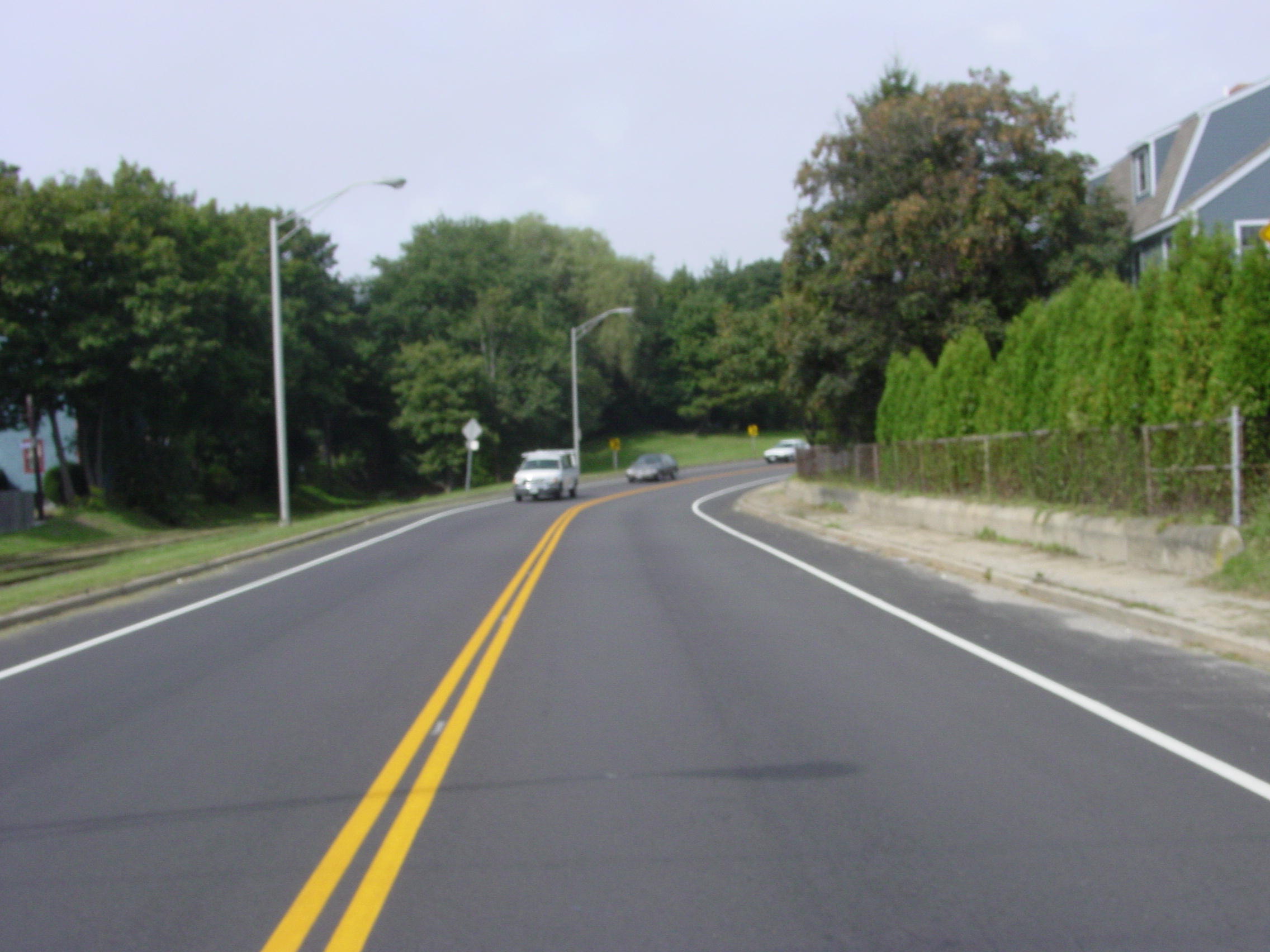 One of the problems in this area is the number of North bound cars that go into curve at too fast a rate of speed. Many of the operators are very surprised to find traffic stopped at the light. This causes many screeching brakes. The 'curve' signs that were blocked by the trees on the East side of the road could have been a factor. On September 16, 2003, Rick Santos and the local RIDOT crew came here and cut back the trees. You can see the difference in these photos. We might still need to add another sign on the West side of the road. |
